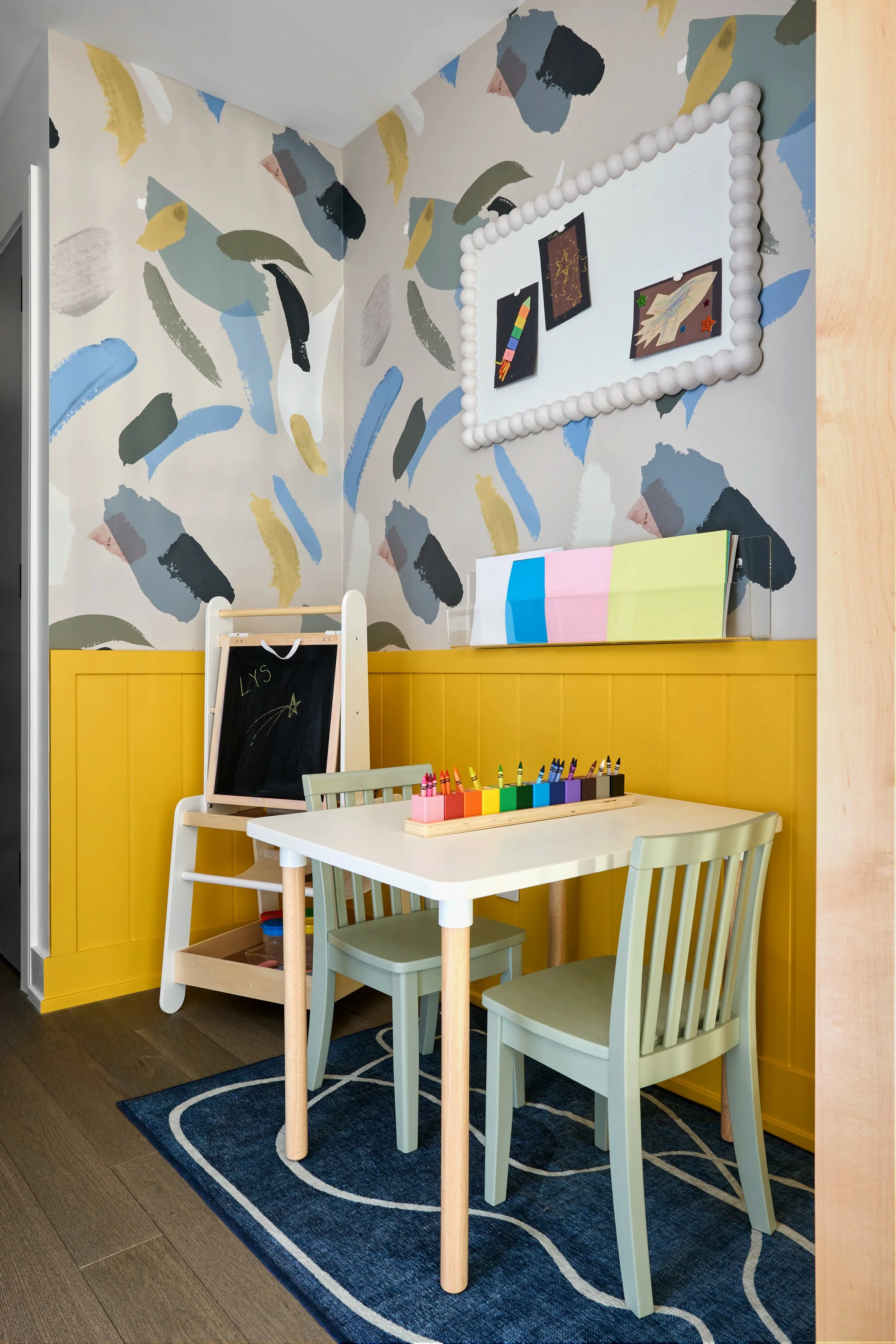 The hallway was designed to be an extension of the bedroom as a space for crafts and creativity. The use of a slat wall against the glass railing adds interest and acts as a threshold between the hallway and the creative nook. Wispy wallpaper with bold brush strokes invigorate the senses and the bright yellow wainscoting pulls from the yellow curtains in the bedroom.
